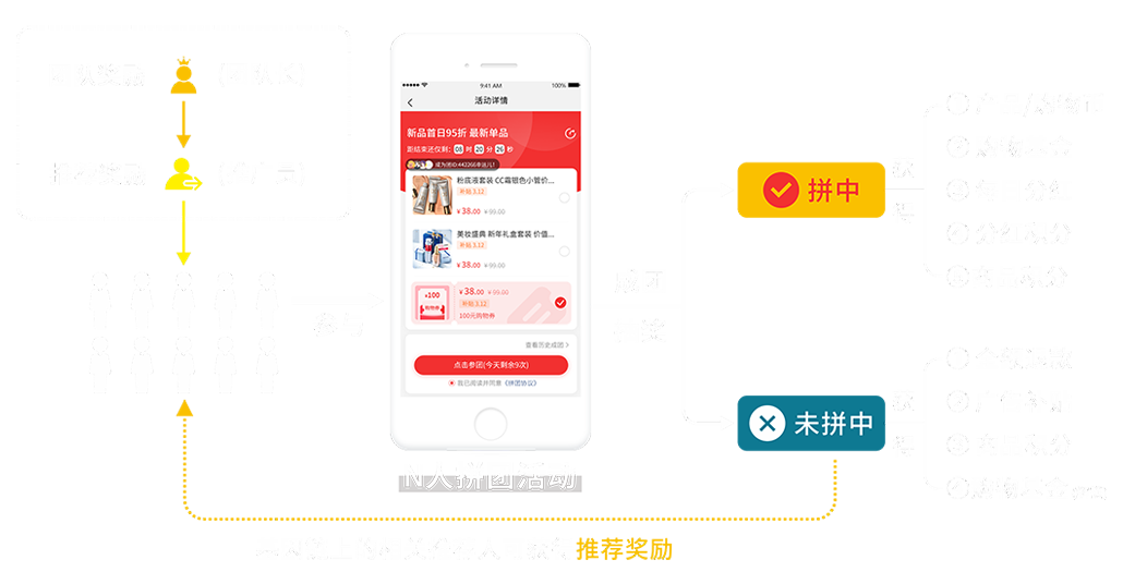 用户可自由参与不同价格(产品)的拼购活动,中奖后可自由选择产品或等值购物币。
